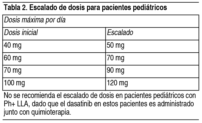 COMPOSICION: Dasanova 20 mg: Cada comprimido recubierto contiene: Dasatinib 20.0 mg, Lactosa Monohidrato 27.0 mg, Celulosa Microcristalina 27.0 mg, Croscarmelosa Sódica 3.2 mg, Hidroxipropilcelulosa 2.4 mg, Estearato de Magnesio 0.4 mg, Alcohol Polivinílico 1.3 mg, Dióxido de Titanio 0.8 mg, Polietilenglicol 0.6 mg, Talco 0.5 mg. Dasanova 50 mg: Cada comprimido recubierto contiene: Dasatinib 50.0 mg, Lactosa Monohidrato 67.5 mg, Celulosa Microcristalina 67.5 mg, Croscarmelosa Sódica 8.0 mg, Hidroxipropilcelulosa 6.0 mg, Estearato de Magnesio 1.0 mg, Alcohol Polivinílico 3.2 mg, Dióxido de Titanio 2.0 mg, Polietilenglicol 1.6 mg, Talco 1.2 mg. Dasanova 70 mg: Cada comprimido recubierto contiene: Dasatinib 70.0 mg, Lactosa Monohidrato 94.5 mg, Celulosa Microcristalina 94.5 mg, Croscarmelosa Sódica 11.2 mg, Hidroxipropilcelulosa 8.4 mg, Estearato de Magnesio 1.4 mg, Alcohol Polivinílico 4.5 mg, Dióxido de Titanio 2.8 mg, Polietilenglicol 2.3 mg, Talco 1.7 mg. Dasanova 100 mg: Cada comprimido recubierto contiene: Dasatinib 100.0 mg, Lactosa Monohidrato 135 mg, Celulosa Microcristalina 135 mg, Croscarmelosa Sódica 16 mg, Hidroxipropilcelulosa 12 mg, Estearato de Magnesio 2.0 mg, Alcohol Polivinílico 6.4 mg, Dióxido de Titanio 4.0 mg, Polietilenglicol 3.2 mg, Talco 2.4 mg. ACCION: Agente Antineoplásico. lnhibidor de la proteína quinasa. Código ATC: L01XE06. INDICACIONES: Dasanova está indicado para el tratamiento de pacientes adultos con: Leucemia mieloide crónica (LMC) con cromosoma Filadelfia positivo (Ph+) en fase crónica recién diagnosticada. LCM en fase crónica, acelerada o blástica, con resistencia o intolerancia al tratamiento previo, incluido imatinib. Leucemia linfoblástica aguda (LLA) con cromosomas Filadelfia positivo (LLA Ph+) y LMC linfoblástica con resistencia o intolerancia a tratamiento previo. Dasanova está indicado para el tratamiento de pacientes pediátricos con: Leucemia mieloide crónica (LMC) con cromosoma Filadelfia positivo (Ph+) en fase crónica recién diagnosticada o leucemia mieloide crónica (LMC) con cromosoma Filadelfia positivo (Ph+) en fase crónica resistente o intolerante a la terapia previa, incluyendo imatinib. Leucemia linfoblástica aguda (LLA) con cromosomas Filadelfia positivo (LLA Ph+) recién diagnosticada en combinación con quimioterapia. DOSIS: El tratamiento debe ser iniciado por un médico especializado en el diagnóstico y tratamiento de los pacientes con leucemia. Pacientes adultos: La dosis inicial recomendada para la leucemia mieloide crónica (LMC) es de 100 mg administrado oralmente 1 vez al día. La dosis inicial recomendada para leucemia mieloide crónica (LMC) en fase acelerada, leucemia mieloide crónica (LMC) en fase mieloblástica o linfoblástica o LLA Ph+ es de 140 mg administrado oralmente 1 vez al día. Población pediátrica (Ph+ LMC - fase crónica y Ph+ - LLA): La dosificación para niños y adolescentes está basada en su peso corporal (ver Tabla 1). Dasatinib se administra 1 vez al día oralmente y la dosis debe ser recalculada cada 3 meses en base a los cambios en el peso corporal o más seguido en el caso de ser necesario. No se recomienda la formulación en comprimidos para pacientes con un peso menor de 10 kg. Los aumentos o reducciones de la dosis se recomiendan con base en las respuestas y la tolerabilidad individual de cada paciente. No hay experiencia en el tratamiento con dasatinib en niños menores de 1 año. La dosis inicial diaria recomendada de dasatinib comprimidos en pacientes pediátricos se muestra en la Tabla 1 a continuación: Ver Tabla Duración del tratamiento: En los estudios clínicos publicados, el tratamiento con dasatinib en adultos con Ph+ LMC en fase crónica, con LMC en fase acelerada o fase mieloblástica o linfoblástica (fase avanzada) o Ph+ LLA y los pacientes pediátricos con Ph+ LMC en fase crónica fue continuado hasta la progresión de la enfermedad o hasta que no pudo ser tolerado por el paciente. El efecto de una suspensión en el tratamiento en el resultado de la enfermedad a largo plazo después de haber alcanzado una respuesta citogenética o molecular (incluyendo respuesta citogenética completa, respuesta molecular mayor y respuesta molecular 4.5) no ha sido investigada. En algunos estudios clínicos publicados, el tratamiento con dasatinib en pacientes pediátricos con Ph+ LLA se administró de modo continuo conjuntamente con bloques sucesivos de quimioterapia de médula ósea, con una duración máxima de 2 años. En los pacientes que recibieron un trasplante subsecuente de células madre, el dasatinib puede ser administrado durante 1 año más postrasplante. Los aumentos o reducciones de dosis se recomiendan con base en la respuesta del paciente y su tolerancia. Incremento gradual de la dosis: En algunos estudios clínicos publicados de pacientes adultos con LMC y LLA Ph+, se permitió el incremento gradual de la dosis a 140 mg 1 vez al día (LMC en fase crónica) o 180 mg 1 vez al día (LMC en fase avanzada y LLA Ph+), en pacientes que no habían alcanzado una respuesta hematológica o citogenética a la dosis inicial recomendada. Los aumentos de dosis que se detallan a continuación en la Tabla 2 se recomiendan en pacientes pediátricos con Ph+ LMC que no alcanzan una respuesta hematológica, citogenética y molecular en los puntos de tiempo recomendados en el tratamiento corriente. Ver Tabla No se recomienda el escalado de dosis en pacientes pediátricos con Ph+ LLA, dado que el dasatinib en estos pacientes es administrado junto con quimioterapia. Ajustes de la dosis para reacciones adversas: Mielosupresión: En algunos estudios clínicos publicados, se controló la mielosupresíón mediante la interrupción o reducción de la dosis o la discontinuación del estudio de la terapia. Las transfusiones de plaquetas y de glóbulos rojos fueron utilizadas como tratamiento apropiado. Se ha usado el factor de crecimiento hematopoyético en pacientes con mielos