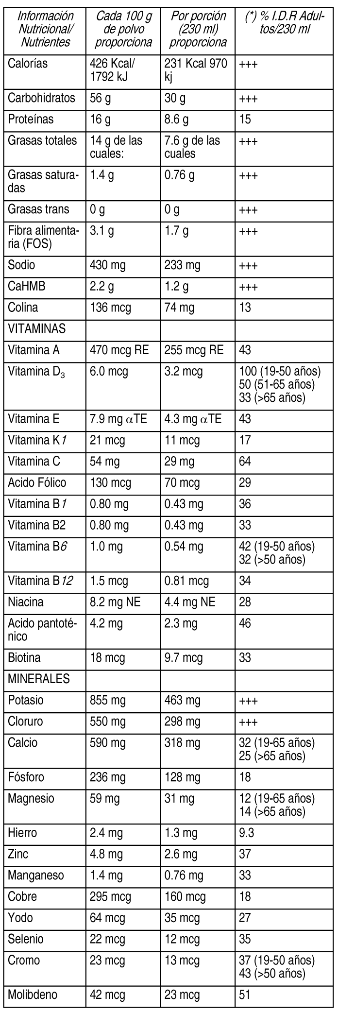| HMB Fos Hidratos de Carbono Minerales Vitaminas Proteínas Lípidos | ||
