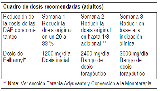 DOSIS: Se estudió el uso de Felbamyl como monoterapia y terapia adyuvante en adultos y como terapia adyuvante en niños con crisis asociadas al síndrome de Lennox-Gastaut. Como Felbamyl se usa en forma concomitante o sustituye a las DAE (drogas antiepilépticas) existentes, se recomienda enfáticamente reducir las dosis de dichas DAE entre un 20 y un 33%, para minimizar los efectos colaterales. Ajuste de la dosis en pacientes con función renal deteriorada: Felbamato debe ser utilizado con cuidado en pacientes con disfunción renal. En estos pacientes, el comienzo y mantenimiento de las dosis deben reducirse a la mitad. El tratamiento adyuvante con medicamentos que afectan las concentraciones plasmáticas de felbamato, especialmente los DAE, pueden justificar una mayor reducción en las dosis diarias de felbamato en pacientes con disfunción renal. Adultos (14 años de edad o mayores): La mayoría de los pacientes recibieron 3.600 mg/día en los estudios clínicos que evaluaron su uso como monoterapia y como terapia adyuvante. Monoterapia: (Terapia inicial) Felbamyl no ha sido evaluado sistemáticamente como monoterapia inicial. Se sugiere comenzar con 1.200 mg/día de Felbamyl en dosis divididas, tres o cuatro veces diarias. En aquellos pacientes que no han recibido tratamiento previo se deberá realizar la titulación del fármaco bajo estricta vigilancia médica, aumentando la dosis 600 mg cada 2 semanas hasta 2.400 mg/día, de acuerdo a la respuesta clínica, y luego hasta 3600 mg/día, si está clínicamente indicado. Conversión a la monoterapia: Se sugiere comenzar con 1.200 mg/día de Felbamyl divididos en tres o cuatro dosis diarias. Reducir la dosis de la terapia antiepiléptica concomitante a la tercera parte al iniciar el tratamiento con Felbamyl. En la semana 2, aumentar la dosis de Felbamyl hasta alcanzar 2.400 mg/día, al tiempo que se reduce la dosis de las otras DAE un tercio adicional con respecto a la dosis inicial. En la tercera semana, aumentar la dosis de Felbamyl hasta alcanzar 3.600 mg/día y continuar reduciendo la dosis de las DAE restantes de acuerdo a la indicación clínica. Terapia adyuvante: Se deberán adicionar 1.200 mg/día de Felbamyl, divididos en tres o cuatro dosis diarias, mientras se reduce la dosis de las DAE administradas en un 20%, con el objeto de controlar las concentraciones plasmáticas de fenitoína, ácido valproico, fenobarbital y carbamazepina y sus metabolitos, utilizadas en forma concurrente. Podrá ser necesario reducir aún más las dosis de las DAE utilizadas en forma concomitante para minimizar los efectos colaterales debidos a las interacciones farmacológicas. Aumentar la dosis de Felbamylcon incrementos de 1.200 mg/día a intervalos semanales hasta alcanzar 3.600 mg/día. La mayoría de los efectos colaterales observados durante la terapia adyuvante con Felbamyl se resuelven a medida que disminuye la dosis de las DAE concomitantes. Ver Tabla Si bien los lineamientos para la conversión al uso de Felbamyl antes indicados requieren 3 semanas para alcanzar la dosis de 3600 mg/día, en algunos pacientes, la titulación para llegar a la dosis de 3600 mg/día de Felbamyl se consiguió en tan sólo 3 días, con el apropiado ajuste del resto de las DAE. Niños con síndrome de Lennox-Gastaut (entre 2 y 14 años de edad): Terapia adyuvante: Se deberán adicionar 15 mg/kg/día de Felbamyl, divididos en 3 ó 4 dosis diarias, mientras se reduce la dosis de las DAE administradas en un 20%, con el objeto de controlar las concentraciones plasmáticas de fenitoína, ácido valproico, fenobarbital y carbamazepina y sus metabolitos, utilizadas en forma concurrente. Podrá ser necesario reducir aún más la dosis de las DAE utilizadas en forma concomitante para minimizar los efectos colaterales provocados por las interacciones farmacológicas. Aumentar la dosis de Felbamyl con incrementos de 15 mg/kg/día a intervalos semanales hasta alcanzar los 45 mg/kg/día. La mayoría de los efectos colaterales observados durante la terapia concurrente con Felbamyl se resuelven a medida que disminuye la dosis de las DAE concomitantes. Información para los pacientes: Se deberá informar a los pacientes que el uso de Felbamyl está asociado con anemia aplásica e insuficiencia hepática, condiciones potencialmente fatales tanto en forma aguda como a largo plazo. El médico debe obtener el consentimiento escrito firmado por el paciente previamente a la iniciación de la terapia con Felbamyl.