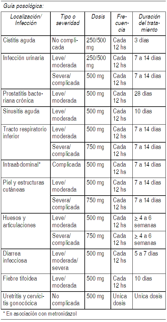 COMPOSICION: Cada comprimido recubierto contiene: Ciprofloxacina (eq. a Ciprofloxacina clorhidrato monohidrato, 582.2 mg) 500 mg. Excipientes c.s. ACCION: Antibacteriano, bactericida. INDICACIONES: Infecciones por cepas sensibles en: sinusitis agudas, infecciones del tracto respiratorio inferior, infecciones urinarias, prostatitis bacteriana crónica, infecciones intraabdominales complicadas, infecciones de la piel, infecciones óseas y articulares, diarrea infecciosa, fiebre tifoidea, gonorrea cervical y uretral no complicada. DOSIS: Ver Tabla CONTRAINDICACIONES: Hipersensibilidad conocida a ciprofloxacina, a otras quinolonas, o a cualquier otro componente de la fórmula. Embarazo. Lactancia. Niños o adolescentes en período de crecimiento. PRESENTACIONES: Envases conteniendo 10 y 20 comprimidos. |