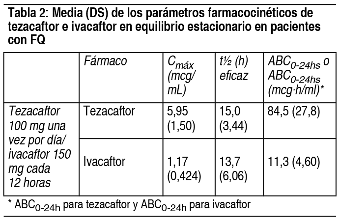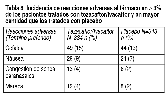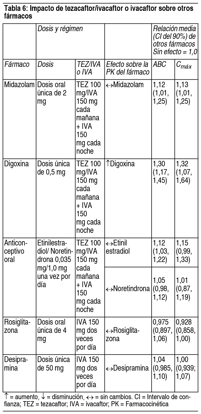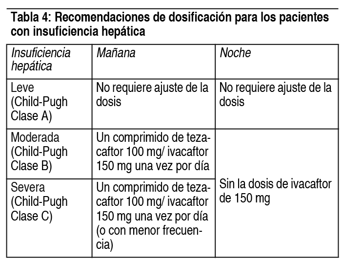 COMPOSICION: Cada comprimido recubierto amarillo de contiene: Ivacaftor 150 mg; Tezacaftor 100 mg. Excipientes: Lauril Sulfato de Sodio, Hidroxipropilmetilcelulosa Acetato Succinato, Hidroxipropilmetilcelulosa E15, Croscaramelosa Sódica, Silica Coloidal Anhidra, Celulosa Microcristalina PH 102, Estearato de Magnesio Vegetal, Aquarius Prime BAT 218006 1), Óxido de Hierro Amarillo, Opadry FX Silver 62W28547 2) c.s. 1) Compuesto por: Dióxido de Titanio, Triacetina, Hidroxipropilmetilcelulosa. 2) Compuesto por: Pigmento Perlado con Base de Mica, Maltodextrina, Carboximetilcelulosa Sódica, Lecitina, Dextrosa Monohidrato. Cada comprimido recubierto celeste contiene: Ivacaftor 150 mg. Excipientes: Laurilsufato de Sodio, Hidroxipropilmetilcelulosa Acetato Succinato, Croscaramelosa Sódica, Celulosa Microcristalina PH101, Polivinilpirrolidona Celulosa Microcristalina PH102, Estearato de Magnesio Vegetal, Opadry II 85F28751 White 1), Indigotina Laca Alumínica, Opadry FX Silver 62W28547 2) c.s. 1) Compuesto por: Alcohol Polivinílico, Dióxido de Titanio, Polietilenglicol, Talco. 2) Compuesto por: Carboximetilcelulosa Sódica, Maltodextrina, Dextrosa Monohidrato, Pigmento Perlado con Base de Mica, Lecitina. ACCION: Modulador de CFTR (regulador de la conductancia transmembrana de la fibrosis quística). Código ATC: R07AX31. INDICACIONES: Tezacar® es una combinación de tezacaftor e ivacaftor, indicado para el tratamiento de pacientes con fibrosis quística (FQ) a partir de los de 6 años de edad y con un peso mayor o igual a 30 kg que son homocigotas para la mutación F508 de lo que presentan al menos una mutación en el gen regulador de la conductancia transmembrana de la fibrosis quística (CFTR) que presenta respuesta al tratamiento con tezacaftor/ivacaftor en base a los datos in vitroy/o la evidencia clínica (ver Propiedades farmacológicas). En caso de desconocerse el genotipo de un paciente, debe efectuarse un análisis de mutaciones del gen de la FQ para detectar la presencia de una mutación en el CFTR y, posteriormente, debe verificarse el esultado con una secuenciación bidireccional según lo recomienden las instrucciones de uso correspondientes al análisis de mutaciones. DOSIS: Información de dosificación en adultos, adolescentes y niños a partir de los de 6 años de edad y con un peso ≥ 30 kg: La dosis recomendada es 1 comprimido (tezacaftor 100 mg/ivacaftor 150 mg) tomado por la mañana y 1 comprimido (ivacaftor 150 mg) tomado por la noche, separados por aproximadamente 12 horas. Tezacar® es para uso oral. Dosis omitidas: Si pasaron 6 horas o menos desde la dosis de la mañana o de la noche que se olvidó tomar, el paciente debe tomar la dosis olvidada tan pronto como sea posible y continuar con el régimen original. Si pasaron más de 6 horas desde la dosis olvidada de la mañana o de la noche, el paciente no debe tomar la dosis olvidada. La siguiente dosis del régimen puede tomarse al horario usual. No debe tomarse más de 1 dosis al mismo tiempo. Posología en poblaciones especiales: Ajuste de la dosis para los pacientes con insuficiencia hepática: Para el ajuste de la dosis para pacientes con insuficiencia hepática,consulte la Tabla 4. No se han realizado estudios en pacientes con insuficiencia hepática severa (Child-Pugh Clase C), pero se espera que la exposición de tezacaftor e ivacaftor sea mayor que en los pacientes con insuficiencia hepática moderada. Por lo tanto, Tezacar® debe usarse con precaución con una dosis ajustada después de evaluar los riesgos y beneficios del tratamiento en estos pacientes (ver Posología y administración, Uso en poblaciones especiales, Propiedades farmacológicas). Ver Tabla Ajuste de la dosis para pacientes que toman fármacos que son inhibidores de la CYP3A: El régimen de dosificación de Tezacar® debería ser ajustado cuando es coadministrado con inhibidores moderados y potentes de la CYP3A. Cuando se coadministra con inhibidores moderados de la CYP3A (por ejemplo, fluconazol, eritromicina), el régimen de dosificación debería ser ajustado como se indica en la Tabla 5 (ver Interacciones con otros Fármacos, Propiedades farmacológicas). Cuando se coadministra con inhibidores potentes de la CYP3A (por ejemplo, ketoconazol, itraconazol, posaconazol, voriconazol, telitromicina y claritromicina), el régimen de dosificación debería ser ajustado como en la Tabla 5 (ver Interacciones con otros fármacos, Propiedades farmacológicas). Ver Tabla Ver Tabla Deberían evitarse alimentos o bebidas que contengan pomelo o naranjas amargas durante el tratamiento con Tezacar® (ver Inteacciones con otros fármacos). Modo de administración: Tezacar® es para uso oral. Indicar a los pacientes que traguen los comprimidos enteros. Tezacar® debería tomarse con alimentos con contenido graso, tales como los alimentos recomendados en las guías nutricionales estándar para la enfermedad. Ejemplos de alimentos que contienen grasa son aquellos preparados con manteca o aceites o aquellos que contienen huevos, quesos, nueces, leche entera, o carnes. CONTRAINDICACIONES: Hipersensibilidad a algunos de los principios activos o algunos de los excipientes. ADVERTENCIAS: Advertencias y precauciones especiales de empleo: Elevaciones de las transaminasas (AST/ALT): Se han observado aumento de transaminasas en pacientes con FQ tratados con tezacaftor/ivacaftor, así como también con monoterapia con ivacaftor. Se recomienda realizar evaluaciones de las transaminasas (ALT y AST) en todos los pacientes antes de comenzar con la administración de Tezacar®, cada 3 meses durante el primer año de tratamiento y luego anualmente. Para los pacientes con antecedentes de elevaciones de las transaminasas debería considerarse un monitoreo más frecuente. En el caso de elevaciones significativas de las transaminasas, por ejemplo, pacientes con valores de ALT o AST >5 del límite superior del rango normal (LSN),o valores de ALT o AST >3 del LSN con valores de 