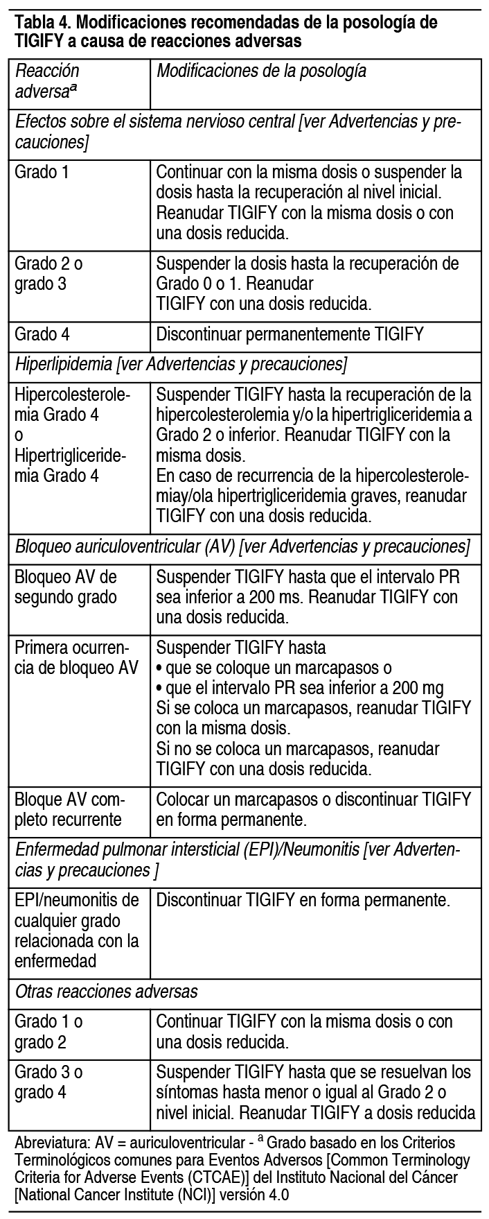 COMPOSICION: Tigify 25 mg: Cada comprimido recubierto contiene: Lorlatinib 25 mg. Excipientes: Celulosa Microcristalina 143.325 mg, Fosfato Dibásico de Calcio Anhidro 71.675 mg, Almidón Glicolato Sódico 7.500 mg, Estearato de Magnesio 2.500 mg, Opadry II 33G200010 Marrón (Hidroxipropilmetilcelulosa, Lactosa Monohidrato, Polietilenglicol, Triacetina, Dióxido de Titanio, Óxido de Hierro Negro y Óxido de Hierro Rojo) 7.500 mg. Tigify 100 mg: Cada comprimido recubierto contiene: Lorlatinib 100 mg. Excipientes: Celulosa Microcristalina 355.540 mg, Fosfato Dibásico de Calcio Anhidro 177.800 mg, Almidón Glicolato Sódico 20.000 mg, Estearato de Magnesio 13.330 mg, Opadry II 33G200003 Lavanda (Hidroxipropilmetilcelulosa, Lactosa Monohidrato, Polietilenglicol, Triacetina, Dióxido de Titanio, Óxido de Hierro Negro y Óxido de Hierro Rojo) 20.000 mg. ACCION: Agente antineoplásico. Código ATC: L01XE44. INDICACIONES: Tigify está indicado para el tratamiento de pacientes con cáncer de pulmón de células no pequeñas (CPCNP) metastásico positivo para la quinasa del linfoma anaplásico (ALK, por sus siglas en inglés) cuya enfermedad haya progresado con el tratamiento con: Crizotinib y al menos otro tratamiento con un inhibidor de la ALK para la enfermedad metastásica; o alectinib como primer tratamiento con un inhibidor de la ALK para la enfermedad metastásica; o ceritinib como primer tratamiento con un inhibidor de la ALK para la enfermedad metastásica. DOSIS: Dosis recomendada: La dosis recomendada de Tigify es de 100 mg por vía oral 1 vez al día, con o sin alimentos, hasta la progresión de la enfermedad o una toxicidad inaceptable. Los comprimidos se deben ingerir enteros. No se los debe masticar, triturar ni partir. No ingiera los comprimidos si están rotos, quebrados o, en definitiva, si no están intactos. Tome Tigify todos los días a la misma hora. Si olvida una dosis, tome la dosis que no tomó, a menos que deba tomar la siguiente dosis dentro de las 4 horas. No tome 2 dosis al mismo tiempo para compensar la dosis que no tomó. No tome una dosis adicional si vomita después de tomar Tigify pero continúe con la siguiente dosis programada. Modificaciones de la dosis a causa de reacciones adversas: Las reducciones de la dosis que se recomiendan son: Primera reducción de la dosis: Tigify 75 mg por vía oral 1 vez al día. Segunda reducción de la dosis: Tigify 50 mg por vía oral 1 vez al día. Tigify debe discontinuarse permanentemente en aquellos pacientes que no pueden tolerar la dosis de 50 mg por vía 1 vez al día. En la Tabla 4 se observan las modificaciones de la posología de Tigify a causa de reacciones adversas. Ver Tabla Uso concomitante de inductores fuertes o moderados de la subfamilia CYP3A: Tigify está contraindicado en pacientes que tomen inductores fuertes del CYP3A. Se deben discontinuar los inductores del CYP3A durante 3 semividas plasmáticas del inductor fuerte del CYP3A antes de iniciar el tratamiento con Tigify. Se debe evitar el uso concomitante de TIGIFY con inductores moderados del CYP3A. Modificación de la posología en caso de tratamiento con inhibidores fuertes del CYP3A: Se debe evitar el uso concomitante de Tigify con inhibidores fuertes del CYP3A. Si no se puede evitar el uso concomitante con un inhibidor fuerte del CYP3A, se debe reducir la dosis inicial de Tigify de 100 mg por vía oral 1 vez al día a 75 mg por vía oral 1 vez al día. A los pacientes a los que se les redujo la dosis a 75 mg por vía oral Tigify vez al día debido a las reacciones adversas y que comiencen un tratamiento con un inhibidor fuerte del CYP3A, se les debe reducir la dosis de Tigify a 50 mg por vía oral 1 vez al día. Si se suspende el uso concomitante el inhibidor fuerte del CYP3A, se debe aumentar la dosis de Tigify (después de 3 semividas plasmáticas del inhibidor fuerte del CYP3A) a la dosis que se tomaba antes de inicia el inhibidor fuerte. PRESENTACIONES: Envases conteniendo 30 comprimidos recubiertos. |