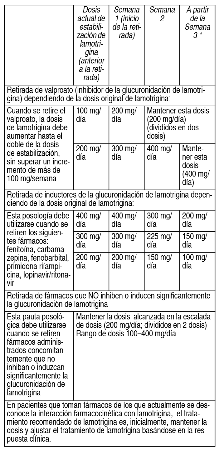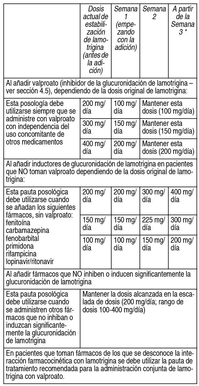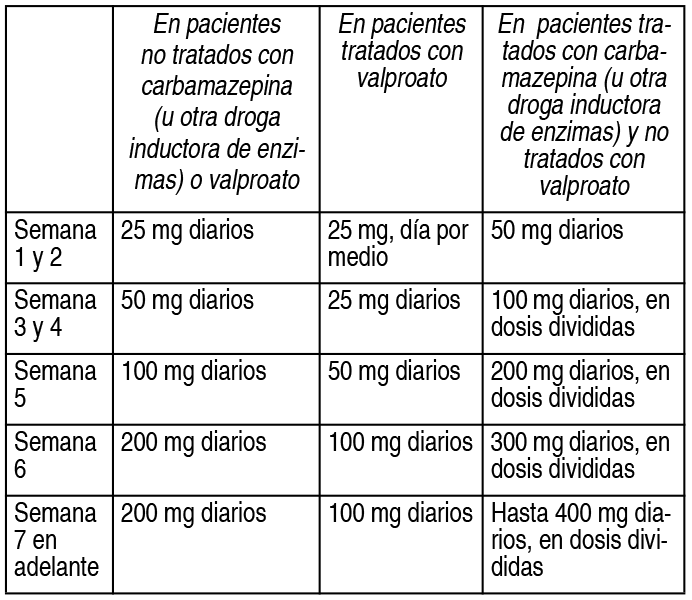 DOSIS: Esquema posológico recomendado: Recomendaciones posológicas en adultos y niños mayores de 12 años: En monoterapia: Semana 1 a 2: 25 mg/día en 1 toma. Semana 3 a 4: 50 mg/día en 1 toma. Posología de mantenimiento: 100 a 200 mg/día en 1 ó 2 tomas diarias. Esta dosis de mantenimiento se alcanza con incrementos de 50 a 100 mg como máximo cada 1 a 2 semanas. En algunos pacientes pueden ser necesarias dosis de hasta 50 mg/día para obtener la respuesta deseada. En asociación con inductores de la glucuronidación (fenitoína, carbamazepina, fenobarbital, primidona, rifampicina, lopinavir/ritonavir) en pacientes que no toman valproato de sodio). Semana 1 y 2: 50 mg/día en 1 toma. Semana 3 y 4: 100 mg/día en 2 tomas. Posología de mantenimiento: 200 a 400 mg/día en 2 tomas. Esta dosis de mantenimiento se alcanza con incrementos de 100 mg como máximo cada 1 a 2 semanas. En asociación con fármacos que no son inductores de la glucuronidación ni con valproato de sodio*: Semana 1 y 2: 25 mg día por medio en 1 toma. Semana 3 y 4: 50 mg/día en 1 toma. Posología de mantenimiento: 100 a 200 mg/día en 1 ó 2 tomas. Esta dosis de mantenimiento se alcanza con incrementos de 25 a 50 mg como máximo cada 1 a 2 semanas. Terapia de adición o coadyuvante: Con valproato de sodio: Semana 1 y 2: 25 mg administrado día por medio, en 1 toma. Semana 3 y 4: 25 mg/día en 1 toma. Posología de mantenimiento: 100 a 200 mg/día en 1 ó 2 tomas diarias. Esta dosis de mantenimiento se alcanza con incrementos de 25 a 50 mg como máximo cada 1 a 2 semanas. * Esta recomendación posológica debe utilizarse con otros medicamentos que no inhiban o induzcan la glucuronidación de lamotrigina de manera significativa. Recomendaciones posológicas en niños de 2 a 12 años: Monoterapia en crisis de ausencia típica: Semana 1 y 2: 0.3 mg/kg/día (1 vez al día o divididos en 2 dosis). Semana 3 y 4: 0.6 mg/kg/día (1 vez al día o divididos en 2 dosis). Posología de mantenimiento: 1-15 mg/kg/día (1 vez al día o divididos en 2 dosis). Para alcanzar las dosis de mantenimiento, las dosis pueden aumentarse en un máximo de 0.6 mg/kg/día cada 1 ó 2 semanas hasta alcanzar la respuesta óptima, con una dosis de mantenimiento máxima de 200 mg/día. Terapia de adición o coadyuvante: con valproato de sodio: Semana 1 y 2: 0.15 mg/kg/día en 1 ó 2 tomas. Semana 3 y 4: 0.30 mg/kg/día en 1 ó 2 tomas. Posología de mantenimiento: 1 a 5 mg/kg/día en 1 ó 2 tomas sin sobrepasar los 200 mg/día. Esta dosis de mantenimiento se alcanza con incrementos de 0.3 mg/kg como máximo cada 1 a 2 semanas. En asociación con inductores de la glucuronidación (fenitoína, carbamazepina, fenobarbital, primidona, rifampicina, lopinavir/ritonavir) en pacientes que no toman valproato de sodio: Semana 1 y 2: 0.6 mg/kg/día repartidos en 2 tomas. Semana 3 y 4: 1.2 mg/kg/día repartidos en 2 tomas. Posología de mantenimiento: 5 a 15 mg/kg/día en 2 administraciones. Dosis máxima: 400 mg/día en 2 tomas. Esta dosis de mantenimiento se alcanza con incrementos de 1.2 mg/kg como máximo cada 1 a 2 semanas. En asociación con fármacos que no son inductores de la glucuronidación ni con valproato de sodio*: Semana 1 y 2: 0.3 mg/kg/día en 1 vez al día o divididos en 2 dosis. Semana 3 y 4: 0.6 mg/kg/día 1 vez al día o divididos en 2 dosis. Posología de manenimiento: 1 a10 mg/kg/día en 1 ó 2 dosis sin sobrepasar los 200 mg/día. Esta dosis de mantenimiento se alcanza con incrementos de 0.6 mg/kg como máximo cada 1 a 2 semanas. * Esta recomendación posológica debe utilizarse con otros medicamentos que no inhiban o induzcan la glucuronidación de lamotrigina de manera significativa. En todos los casos la dosis inicial recomendada no deberá excederse y deberá respetarse el aumento progresivo de las dosis, debido al riesgo de erupción cutánea. Puede tomar varias semanas o meses conseguir una dosis de mantenimiento individualizada. Puede ser necesario aumentar hasta en un 50%, las dosis de mantenimiento en pacientes con un peso inferior a 30 kg con base en la respuesta clínica, independientemente de su edad o el DAE concomitante. Se debe controlar el peso del niño para asegurar que se mantiene la dosis terapéutica y en caso de que se produzcan cambios en el peso del paciente, la dosis debe ajustarse. Es probable que los pacientes entre 2 y 6 años requieran una dosis de mantenimiento en el límite superior de la recomendada. Niños menores de 2 años: No se dispone de información suficiente sobre la eficacia y la seguridad de lamotrigina como terapia complementaria de crisis focales en niños menores de 2 años. Estrategia de discontinuación: en pacientes tratados con lamotrigina en forma concomitante con otras DAE, se deberá reevaluar todas las DAE incluidos en el régimen en caso de cambios en el control de las convulsiones, o de la aparición o empeoramiento de las reacciones adversas observadas. Si se decide discontinuar el tratamiento con lamotrigina, se recomienda una reducción progresiva de la dosis durante un lapso de hasta 2 semanas (aproximadamente un 50% por semana) al menos que se requiera una reducción más rápida. La discontinuación de DAE y otros fármacos inductores de enzimas puede prolongar la vida media de lamotrigina, y la discontinuación del ácido valproico acortarla. Trastorno bipolar: Adultos (≥18 años): La dosis blanco de lamotrigina es 200 mg/día (100 mg/día en combinación con valproato y 400 mg/día en combinación con carbamazepina u otras drogas inductoras de enzimas). En estudios clínicos con lamotrigina como monoterapia, no se han observado beneficios adicionales con 400 mg/día en comparación con 200 mg/día. El tratamiento con lamotrigina es introducido, dependiendo de la medicación concomitante, con el siguiente régimen posológico: Ver Tabla Si luego de la estabilización del paciente, se discontinúa alguna de las medicaciones psicotrópicas concomitantes, la dosis de lamo