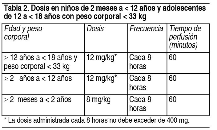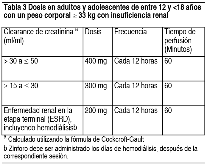 COMPOSICION: Cada frasco-ampolla contiene: Ceftarolina Fosamil 600 mg. Excipientes: L-arginina. ACCION: Código ATC: JO1DI02. Antibacterianos para uso sistémico, otras cefalosporinas. INDICACIONES: Zinforo está indicado para el tratamiento de las siguientes infecciones en adultos y niños a partir de 2 meses de edad: Infecciones complicadas de la piel y los tejidos blandos (IPTBc). Neumonía adquirida en la comunidad (NAC). Se deben tener en consideración las recomendaciones oficiales sobre el uso adecuado de agentes antibacterianos. DOSIS: Adultos y adolescentes de 12 a < 18 años con peso corporal ≥33 kg: ver Tabla 1. Ver Tabla Ver Tabla Poblaciones especiales: Pacientes de edad avanzada: No se requiere ajuste de dosis en pacientes de edad avanzada con valores de clearance de creatinina > 50 ml/min. Insuficiencia renal: La dosis debe ser ajustada cuando el clearance de creatinina (CrCL) sea ≤50 ml/min, tal como se muestra a continuación. Las recomendaciones de dosis para niños y adolescentes están basadas en modelos farmacocinéticos. No hay información suficiente para recomendar ajustes de dosis en adolescentes de entre 12 a <18 años con peso corporal < 33 kg y en niños de entre 2 y 12 años con ESRD. No hay suficiente información para recomendar ajustes de dosis en niños de 2 meses a < 2 años con insuficiencia renal moderada o grave o ESRD. Ver Tabla Ver Tabla Insuficiencia hepática: No se considera necesario el ajuste de dosis en pacientes con insuficiencia hepática. Población pediátrica: No se ha establecido todavía la seguridad y eficacia de Zinforo en niños menores de 2 meses de edad. Modo de administración: Zinforo se administra mediante infusión endovenosa durante 60 minutos para todos los volúmenes de infusión (50 ml, 100 ml o 250 ml) (ver Precauciones especiales de eliminación y otras manipulaciones). Los volúmenes de infusión para pacientes pediátricos variarán de acuerdo al peso del niño. La concentración de la solución para infusión durante la preparación y administración no debe exceder de 12 mg/ml de ceftarolina fosamil. Precauciones especiales de eliminación y otras manipulaciones: El polvo debe reconstituirse con agua para preparaciones inyectables y el concentrado resultante debe entonces diluirse inmediatamente antes de su uso. La solución reconstituida es una solución de color amarillo pálido que está libre de partículas. Para la preparación y administración de la solución se deben emplear técnicas asépticas estándares. El polvo de Zinforo debe reconstituirse con 20 ml de agua para preparaciones inyectables. La solución resultante debe ser agitada antes de ser transferida a una bolsa o botella para infusión que contenga cloruro sódico 9 mg/ml (0.9%) solución para inyección, dextrosa 50 mg/ml (5%) solución para inyección, cloruro sódico 4.5 mg/ml y dextrosa 25 mg/ml solución para inyección (0.45% cloruro sódico y 2.5% dextrosa) o solución lactato de Ringer. Se puede utilizar una bolsa para infusión de 250 ml, 100 ml o 50 ml para preparar la infusión, basándose en el volumen requerido del paciente. El intervalo de tiempo total entre el comienzo de la reconstitución y la finalización de la preparación de la infusión endovenosa no debe exceder los 30 minutos. Los volúmenes de infusión para pacientes pediátricos variarán de acuerdo con el peso del niño. La concentración de la solución para infusión durante la preparación y administración no debe exceder de 12 mg/ml de ceftarolina fosamil. Cada frasco-ampolla es sólo para un único uso. La eliminación del medicamento no utilizado y de todos los materiales que hayan estado en contacto con él, se realizará de acuerdo con la normativa local. Período de validez: Tras la reconstitución: El vial reconstituido debe utilizarse inmediatamente. Tras la dilución: Una vez que se ha preparado la solución intravenosa con diluyentes incluidos en Precauciones especiales de eliminación y otras manipulaciones debe administrarse dentro de las 6 horas siguientes a su preparación. Se ha demostrado la estabilidad química y física en uso durante un período de hasta 24 horas a 2-8º C. Una vez retirado de la refrigeración a temperatura ambiente, el producto diluido debe utilizarse en un plazo de 6 horas. Desde un punto de vista microbiológico, el medicamento debe utilizarse inmediatamente. Si no se utiliza inmediatamente, los tiempos de conservación en uso y condiciones antes de usar son responsabilidad del usuario y normalmente no deberían ser más de 24 horas a una temperatura entre 2 a 8º C, a menos que la reconstitución/dilución haya tenido lugar en condiciones asépticas controladas y validadas. PRESENTACIONES: Envase conteniendo 10 frascos-ampolla. |